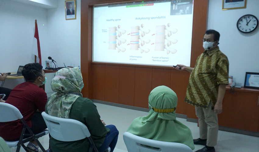 Dalam pemaparannya, dokter spesialis ortopedi, traumatologi dan rawan sendi RSKB Halimun, Dr dr H Briliantono M Soenarwo SpOT, FICS, MD, PhD, MBA menjelaskan, Ankylosing Spondylitis adalah peradangan tulang belakang yang menyebabkan tumbuhnya tulang baru.